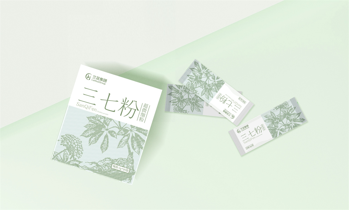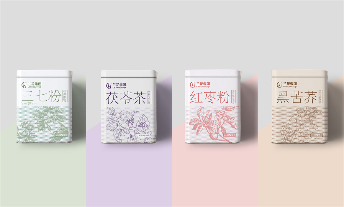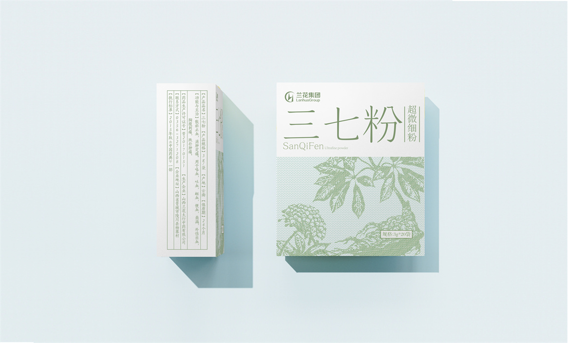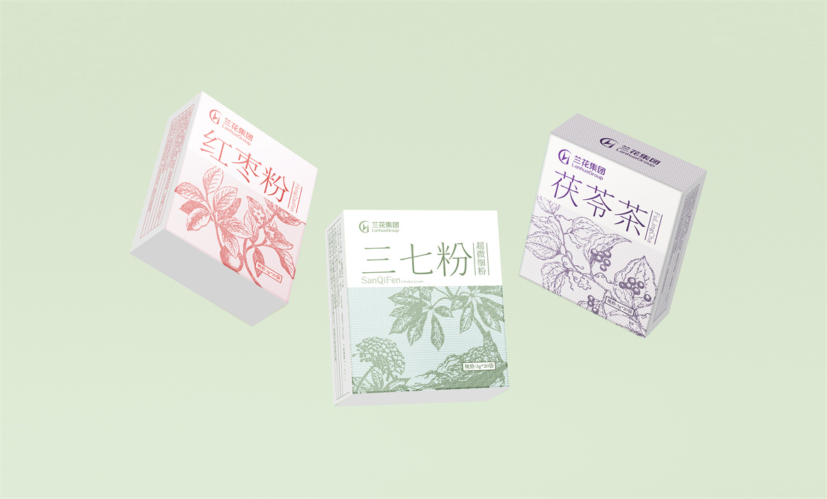 晋东南地区作为炎帝故里,中医药文化历史悠久,有着神农尝百草的典故,中医草药种类丰富,是天然的中草药生产基地,具有得天独厚的区位优势。兰花中药正坐落于此,所以此次兰花中药品牌包装设计以太行山道地药材为核心诉求,以草本药材插画为主视觉符号,结合产品形态——超微细粉,设计了小微颗粒状的均布点状形式,以简洁、干净、纯粹的设计风格表达,使品牌、产品、视觉符号结构清晰、主次要信息分明,清新美观大方,并以产品认知自然本色进行系列化延伸,多而不散,繁而不乱,既能做到系列产品形式统一,又能明确单品区分。