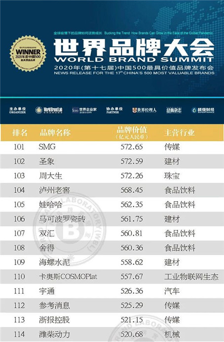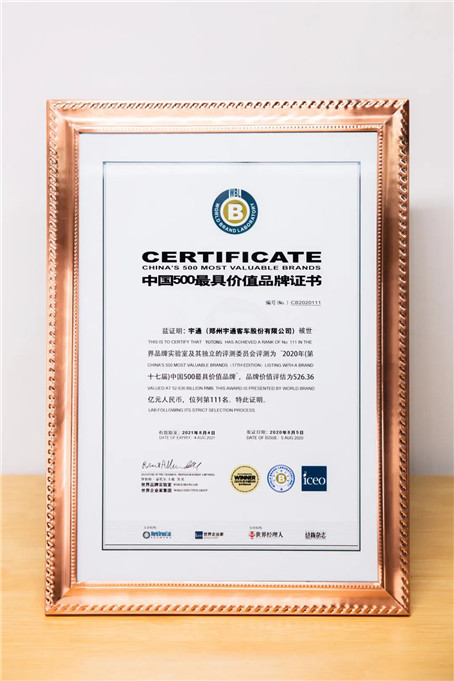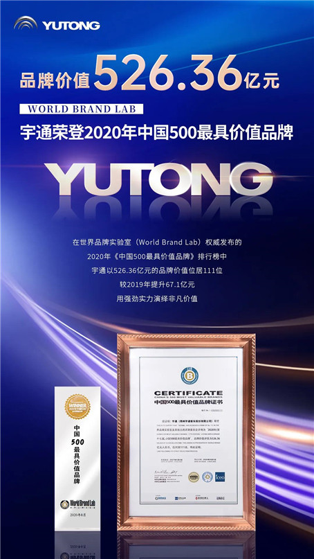 2020年8月5日,由世界品牌实验室主办的第十七届“世界品牌大会”在北京举行,发布了2020年《中国500最具价值品牌》排行榜,宇通以526.36亿元的品牌价值位居111位,与海尔、腾讯、阿里等知名品牌一同上榜.相比较2019年,宇通品牌价值提升67.1亿元,在上榜500强的汽车企业中排行第十,彰显了中国客车自主品牌的强劲实力。