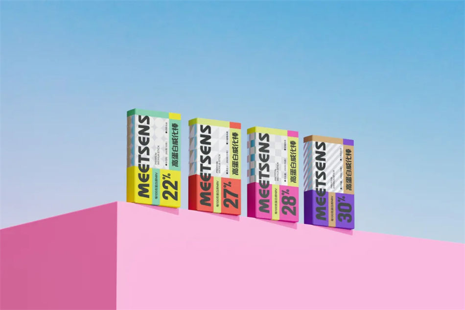 NDL在对Meetsens膳食品牌设计的过程中,充分考虑年轻消费者的审美偏好和购买习惯,运用色彩与几何纹理的拼接手法,将文字信息合理模块化,使得膳食品牌包装既美观又易于阅读。同时,放大了蛋白质含量这一关键信息,以吸引那些注重健康饮食的消费者,营造出美味健康让人心情愉悦的视觉感受图片。